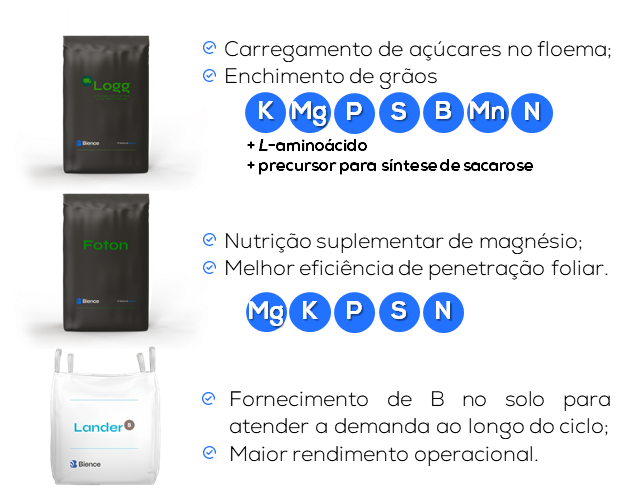 O magnésio (Mg) também possui papel chave no aumento do peso de grãos. Este nutriente atua no transporte de carboidratos das folhas para os grãos, na fotossíntese e na ativação enzimática. Sua deficiência pode impactar negativamente a taxa fotossintética, o crescimento radicular, o desenvolvimento geral da planta, a produtividade e a suscetibilidade ao estresse luminoso (Cakmak et al, 1994). Dessa forma, a aplicação de magnésio pode trazer benefícios tanto na fase vegetativa – com promoção do desenvolvimento radicular, ativação da Rubisco, produção de açúcares e tolerância ao estresse - quanto na fase reprodutiva, através do aumento do peso de 100 grãos (Gao et al., 2014). (Figura 2).